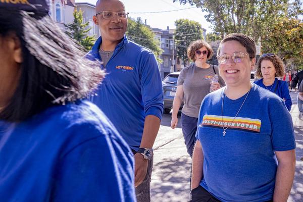 Banner Image: Network Lobby community organizers Christian Watkins and Sister Emily TeKolste participate in a mission action in San