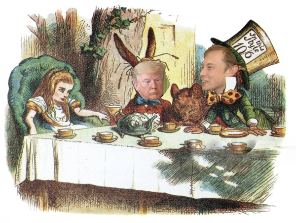 Alice, representing all of us, looks suspiciously at Trump and Musk holding forth at their Mad Tea Party. Composite image by team member Rosanna Tufts; based on Sir John Tenniel’s original illustration from 1865. Wikimedia Commons. |