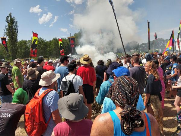 Smoking ceremony, Aboriginal Tent Embassy, Parkes, Australia, at the end of the Invasion Day march, 2019. Photo by Edgar Crook on Flickr. |