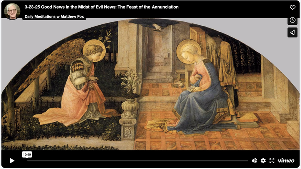SIGN THE PLEDGE: Boycott pro-Trump corporations for Lent this year. Faithful America. See Matthew Fox, Sheer Joy: Conversations with Thomas Aquinas on Creation Spirituality. And Fox, Original Blessing: A Primer on Creation Spirituality. See Fox, Trump & The MAGA Movement as Anti-Christ. And Fox, Sins of the Spirit, Blessings of the Flesh: Transforming Evil in Soul and Society. And Fox, “Spiritual Warriorhood,” in Fox, One River, Many Wells: Wisdom Springing from Global Faiths, pp. 404-422. See also: Fox, The Coming of the Cosmic Christ. And Matthew Fox and Bishop Marc Andrus, Stations of the Cosmic Christ. Banner Image: The Annunciation by Fra Filippo Lippi (1406-69) in the