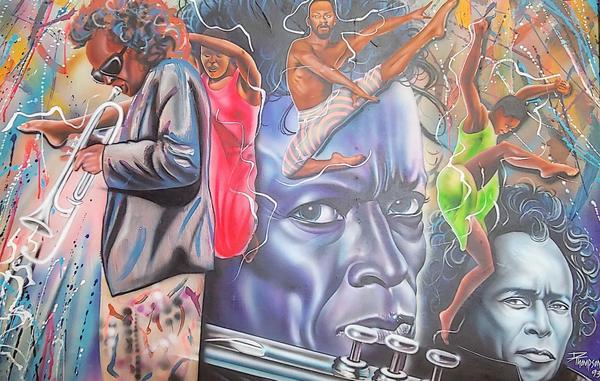 not just belong to the doer but also to the receiver of art: To behold or take in a painting, music, dance, film is itself the work of an artist in all of us. Consider how this painting calls up the music and dance memories of our lives by recalling the work of Miles Davis. His album, Kind of