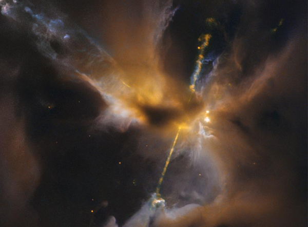 Banner Image: “Hubble Sees the Force Awakening in a Newborn Star — In the center of the image, partially obscured by a dark, Jedi-like cloak of dust, a newborn star shoots twin jets of superheated gas out