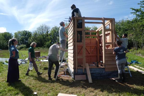 Banner Image: People power, reclaiming human waste: A volunteer team builds a composting outhouse at Parc