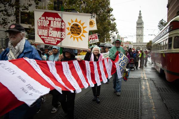 “Led by veterans, hundreds of people representing labor, faith groups, immigrant rights and outraged communities marched in San Francisco, calling on [California Senators] to stop sending arms to Israel.” Photo by Peg Hunter on Flickr. | The Sufi mystic Hafiz knew the difference between solider and warrior when he exclaimed in one of his poems that soldiers “were lying all around him in excruciating pain”—for that is what a soldier does, deliver or receive death or excruciating