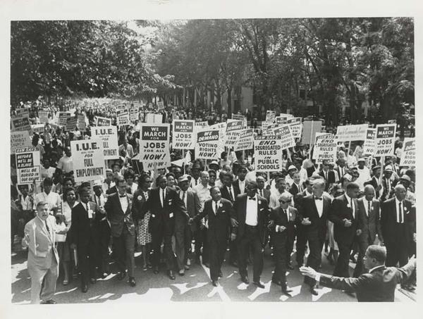 on Washington, with several other civil rights leaders on the front line. Photo from the Center for Jewish History. Wikimedia Commons. | For a list of organizations helping those affected by the devastating LA wildfires, please see this article from the LA Times HERE.