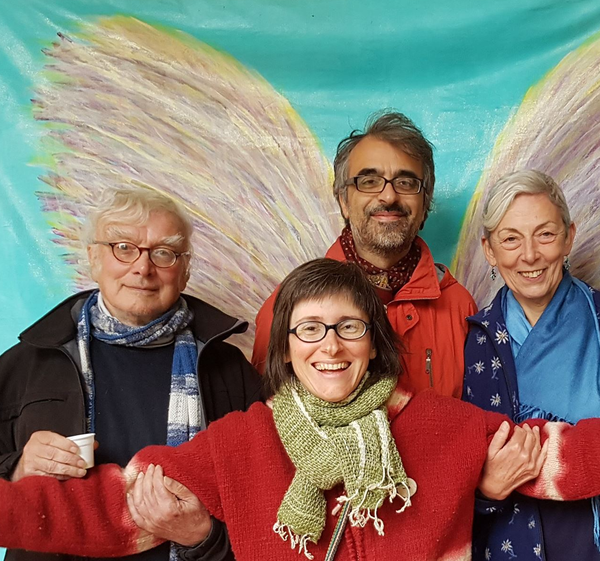 P. Giorgi (on left, GG (center), and friends. From GG’s personal collection, with permission. | This is the same task that Piero Giorgi presents for humanity in his scientific works (see the DMs of July 2 and July 3). He can indeed be a very valuable ally of Creation Spirituality, as he gives solid scientific reasons supporting the notion that human nature is nonviolent — in and of itself. |