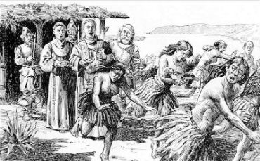 Indigenous people flee Franciscan friars in this anonymous image from “The Canonization of Junipero Serra” by Vision Maker Media |