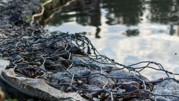 Banner Image: Half-submerged stones wrapped in chicken wire — an abandoned flood prevention effort — echo the ridged hide of an alligator and hint at the many dangers facing the victims of Alligator Alcatraz. Photo by
