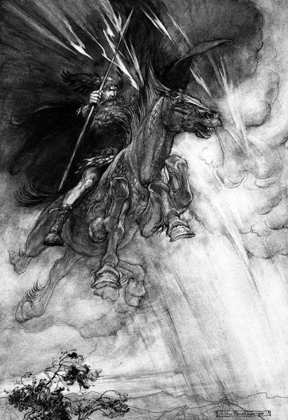 “Raging, Wotan rides to the Rock!” Rackham, Arthur (illustrator), The Rhinegold & the Valkyrie, 1910. Wikimedia Commons, Public Domain. |