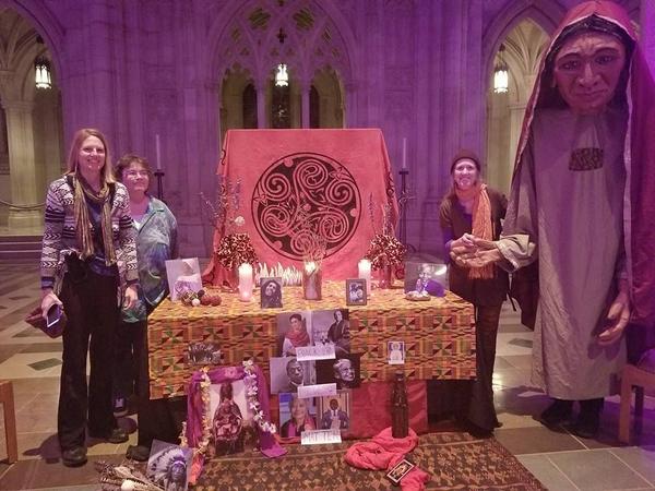 Volunteers at a Cosmic Mass stand with the altar they built to honor modern saints. Photo from Matthew Fox’s files. |