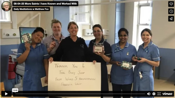 Many Wells: Wisdom Springing From Global Faiths. Fox, Creation Spirituality: Liberating Gifts for the Peoples of the Earth. Fox, Original Blessing: A Primer in Creation Spirituality. Banner Image: Nurses and doctors of Britain’s National Health Service thank Anita Roddick for donations of over 500,000 of The Body Shop UK’s products, to help in the fight against Covid-19. From The Body Shop’s website.