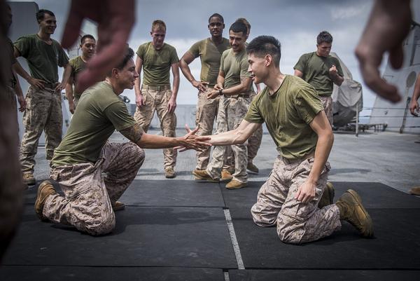 Two Marines greet each other before sparring, during the Marine Corps Martial Arts Program training aboard the USS New Orleans. Photo from the MCMAP. Wikimedia Commons. | Like aggression, shame goes back a