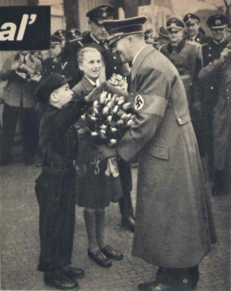False father: Hitler Youth present a bouquet of roses to the Führer, 1939. Wikimedia Commons. |