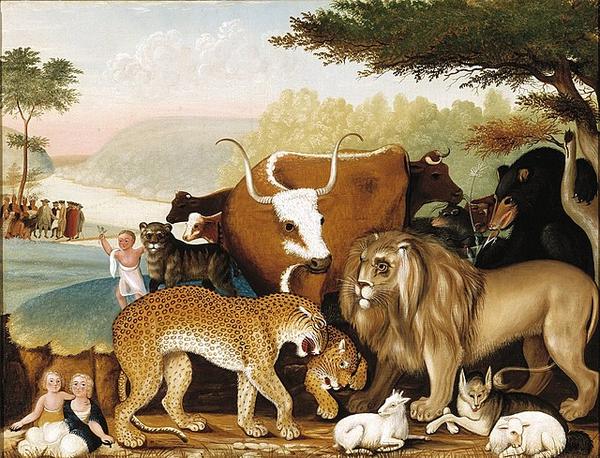 One of Edward Hicks’ 60 paintings on “The Peaceable Kingdom,” this one was created 1845-1847. Wikimedia Commons. Public Domain |