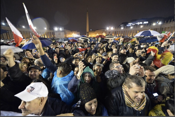 In St. Peter’s Square, the faithful react to the election of Pope Francis in March 2013. Photo by Alberto Pizzoli on Flickr. |