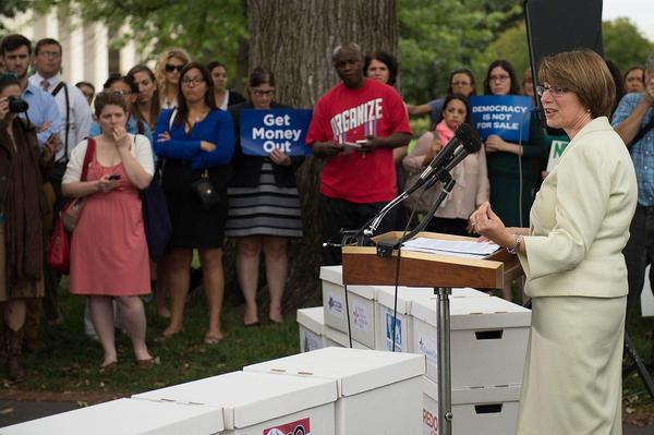 Sen. Amy Klobuchar (D-MN) speaks at a 2014 press conference about a proposed constitutional amendment that would overturn Citizens United. Photo by Senate Democrats. Wikimedia Commons. |