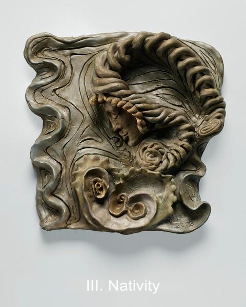 made it): In the Nativity, I put the mother with the child, presenting her with a blessed face—she is happy, and she is tender, pleased with the fetus that starts forming in her womb. The shape of the head is like the umbilical cord, which is connected of course with the fetus. In the back are the lines, which represent explosion of life coming to be in the universe. Blood flows and life is passed on. On the left side is a curve to present the curve of life itself. Life never goes in one way; it always goes in different directions. The colors are pastel stone, brownish, and this mother—any mother—is happy at giving birth. The fetus might be seen as infinity, in which case the mother is a Cosmic Mother, a Cosmic Mary, mother of the