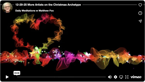Matthew Fox website, where you can see the meditation in a larger version and also view and post your Comments. In the sharing that follows, a kind of community is developing around the DM. If you can't reach today's post on the website directly, click HERE. If you can't reach Matthew's video on the website, try his Vimeo channel HERE. |