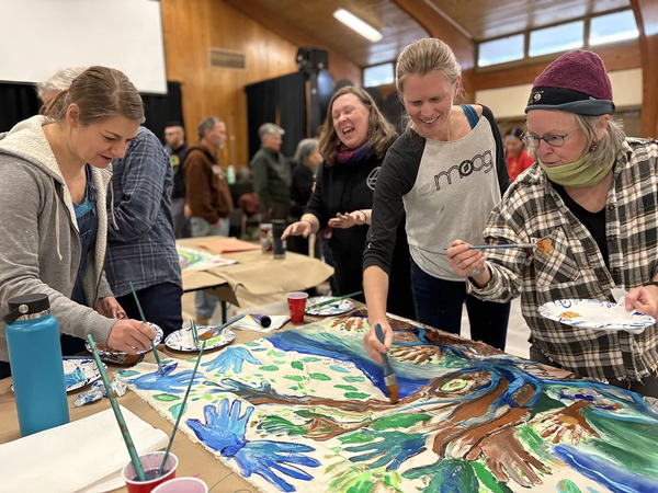 Participants collaborate on a painting at one of Lily Yeh’s post-Helene workshops at Swannanoa, NC. Photo from the Barefoot Artists Year in Review. Published with permission. |