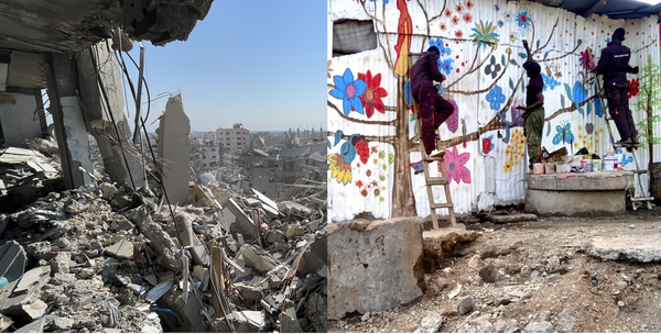 Banner Image: 2025—the anguish and the healing. (L) A bombed-out building in Gaza, January 2025. Wikimedia Commons. (R) The Alfajiri Street Kids—former street kids—create a Tree of Life as part of a community healing project in one of the oldest slums in Nairobi. From the Barefoot Artists website. Published with permission. |
