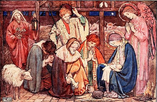 The Holy Family in a stable, with visitors. From the book The Golden Staircase: Poems and Verses for Children (1907) Wikimedia Commons. |