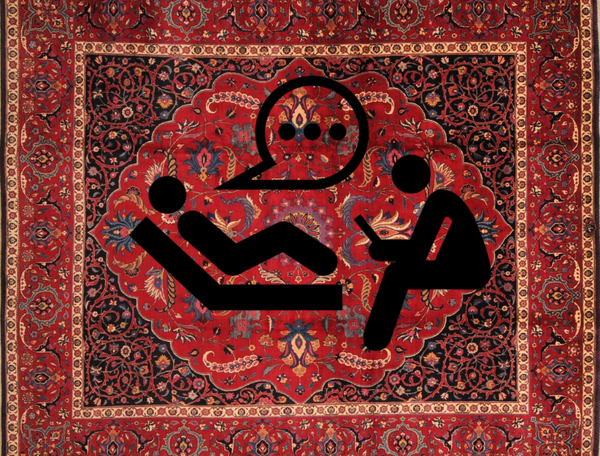 Banner Image: An icon by Luis Prado, representing psychotherapy, against an antique Persian Mashad rug background similar to the coverings on Sigmund Freud’s famed couch. Both images on Wikimedia Commons. |