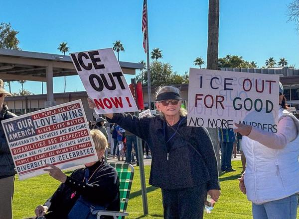 Banner Image: Some of the signs seen from the street at the Palm Springs rally of 1-11-26 against ICE and their tactics against immigrants. Photo
