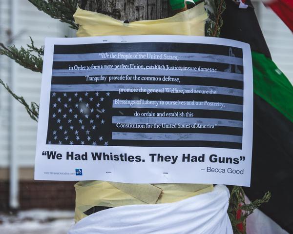 “We Had Whistles. They Had Guns.” Sign left after an anti-ICE protest in Minneapolis. Photo by Ken Fager on Flickr. |