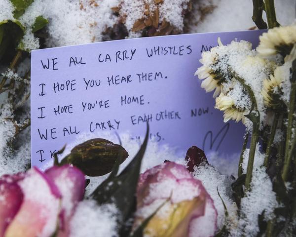 An anonymous poem tucked among flowers and stuffed animals at a Minneapolis memorial for Renee Good. Photo by Ken Fager on Flickr. |