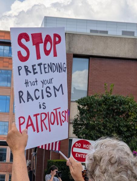 Anti-racism sign at Labor Day protest in Doylestown, PA. Photo by Cynthia Greb. Used with permission. | It is contrary to Jesus’ teachings to preach that some people are less than human or that there is only one version of humanity—that which mirrors oneself. People who are so insecure about their sexuality that they have to make scapegoats of others ought to look in the mirror and examine their own