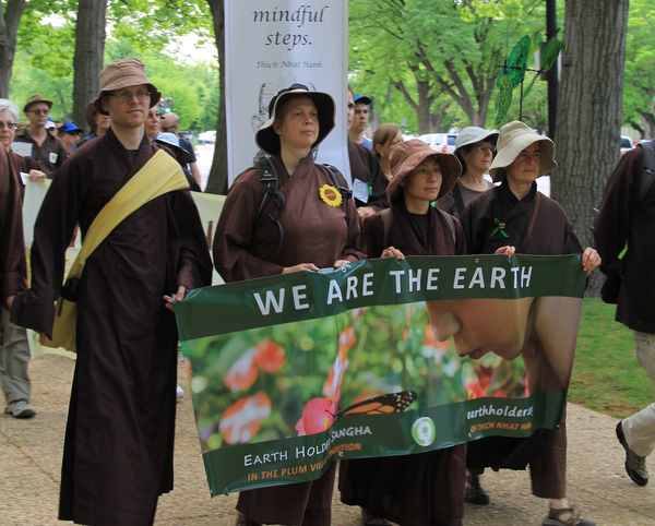 Banner Image: Guided by a vow: People’s Climate March 2017 in Washington DC. Ordained members of the Earth Holder Sangha wearing brown robes carry a banner and practice mindful walking on the sidewalk near Senate Park. Wikimedia Commons. |