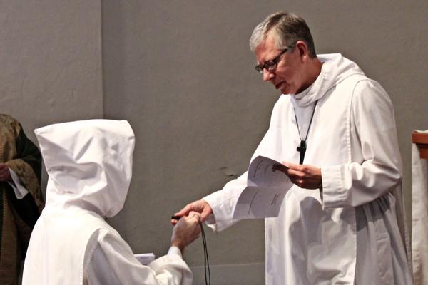 A novice monk receives his cross as part of professing vows at Holy Cross Monastery, New York. Photo by Randy Greve on Flickr. |