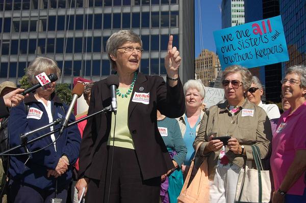 Banner Image: Sister Simone Campbell of “Nuns On The Bus” speaking up for justice at the Whitehall / South Ferry terminal, lower Manhattan. Photo by Thomas Altfather Good on Wikimedia Commons. |