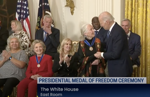 Jane Goodall receives the Presidential Medal of Freedom from President Joe Biden, January 4, 2025. Photo clipped from CSPAN coverage. |
