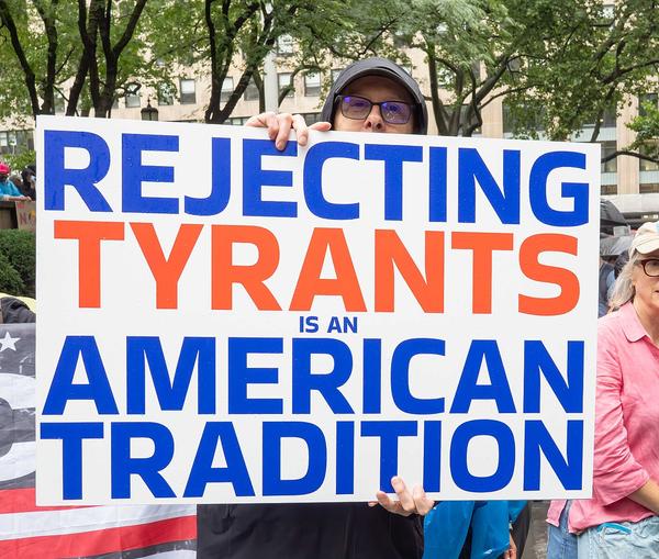 Veronica Riccobene and David Sirota, “Anthony Kennedy is Trying to Find the Guy Who Did This,” The Lever, October 14, 2025. ** Connor Greene, “Trump’s Department of Homeland Security Embraces a Word With Ties to White Nationalism,” Time, October 16, 2025. Banner Image: A sign seen at the “No Kings” rally in New York City, June 14, 2025.