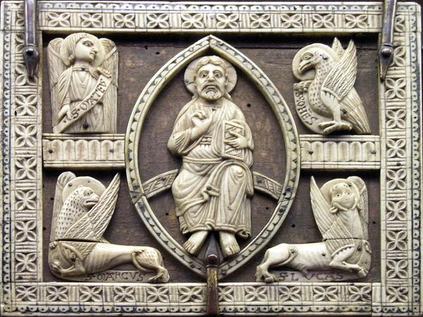 Christ in glory in a mandorla, surrounded by emblems of the evangelists: ivory plaques on a wooden coffret, Cologne, first half of the 13th century. From the Musée de Cluny in Paris. Wikimedia Commons. | However, I am much more interested in the spiritual aspect than in the sexuality aspect per se. Some point out, quite correctly, that Jesus was also seen as mother — most notably by Julian of Norwich. Connecting the dots, one gets a fluid and bi-gendered image of the Savior: a body that is both male and female, that gives birth to the faithful by means of the