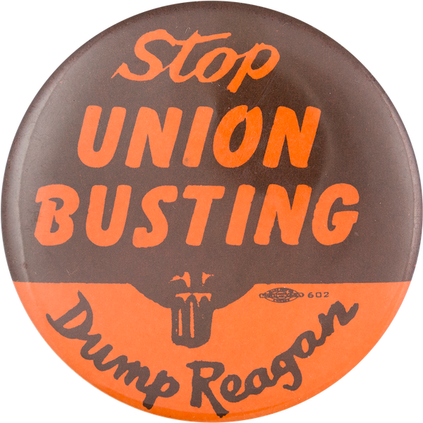1984-era resistance: “Stop Union Busting – Dump Reagan” political button. From Pngkey.com. | Big business and billionaires discovered that a few million dollars can result in trillions in returns. More recently, “Republicans on the Supreme Court legalized” this “democracy-killing corruption.” Union bosses were demonized, right-wing radio and Fox “news” echoed the message. When Reagan came into office, the middle class constituted about 60-65% of America. Today it is under 45%. |