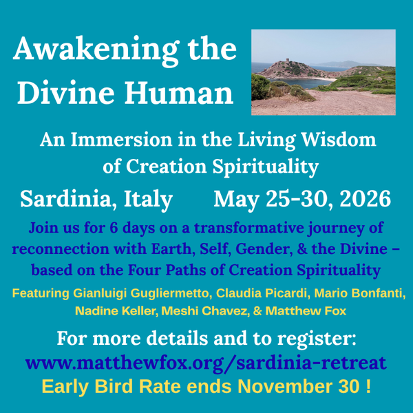 "Retreat: Awakening the Divine Human: An Immersion in the Living Wisdom of Creation Spirituality - Sardinia." Mon., May 25 - Sat., May 30. To register, click HERE. |