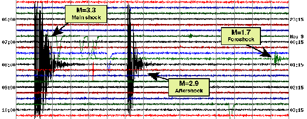 A digital seismogram of three earthquakes that took place on Fremont, Peak, CA, on May 9, 2000. Archival image from USGS.gov on Wikimedia Commons. |