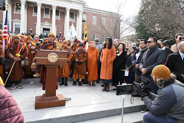 The monks were invited to make one more stop after the Lincoln Memorial: Lt. Governor Miller Welcomes Theravada Buddhist Monks to the Maryland State House. Photo by Maryland GovPics. Wikimedia Commons. |